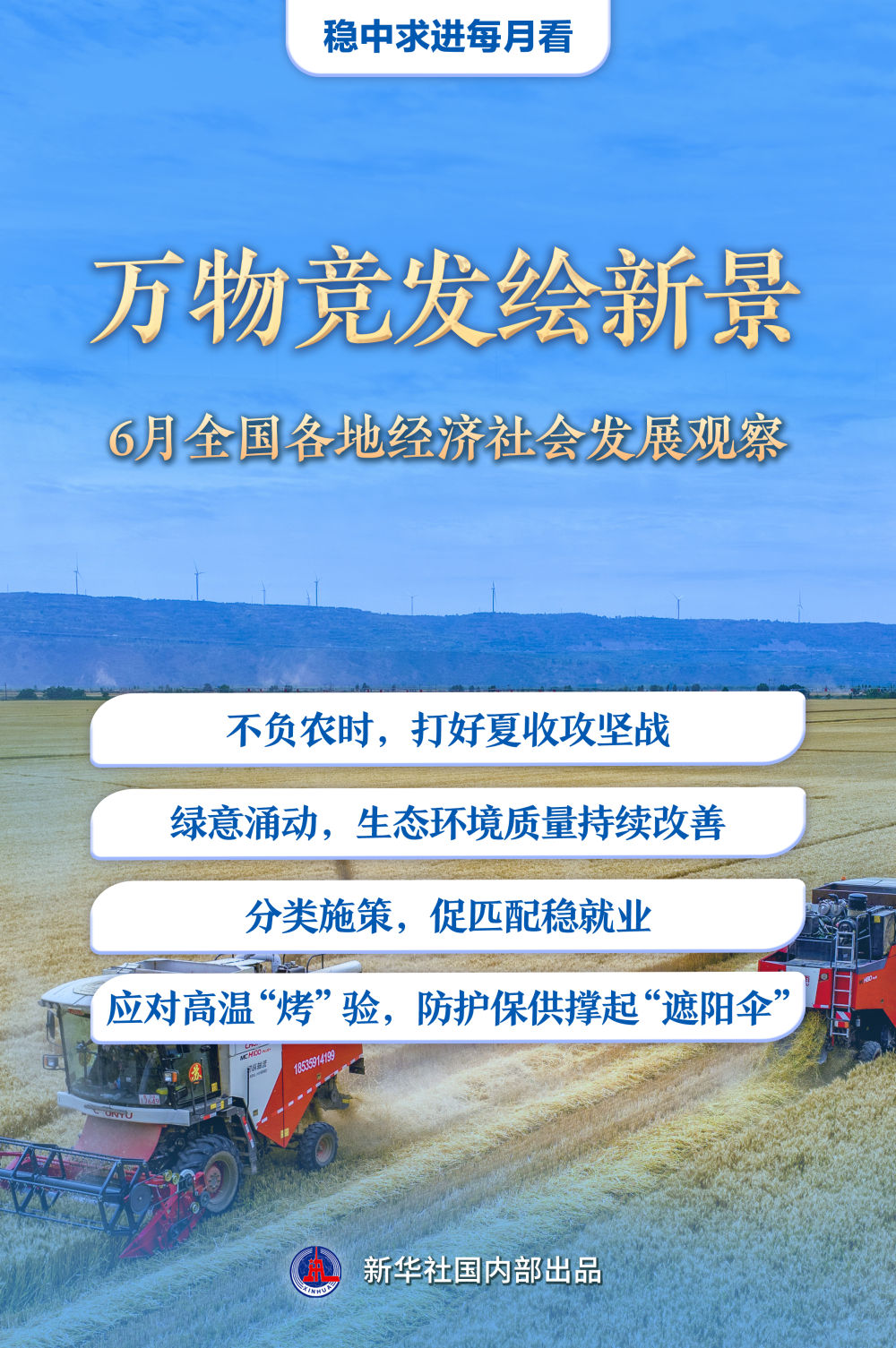 6月仲夏,萬物豐茂。廣袤農(nóng)田上,“三夏”生產(chǎn)進(jìn)入關(guān)鍵階段;綠水青山間,低碳發(fā)展不斷繪就新圖景;全力穩(wěn)就業(yè),政府、企業(yè)與高校同頻共振;高溫“烤”驗(yàn)下,做好各項(xiàng)保障工作……上半年收官之月,各地各部門統(tǒng)籌推進(jìn)穩(wěn)增長(zhǎng)、促改革、惠民生舉措,推動(dòng)經(jīng)濟(jì)社會(huì)沿著高質(zhì)量發(fā)展之路穩(wěn)步前行。