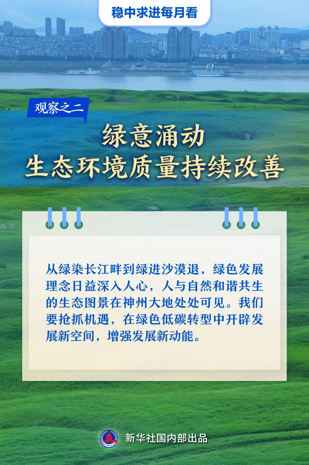 【記者觀察】從綠染長(zhǎng)江畔到綠進(jìn)沙漠退,綠色發(fā)展理念日益深入人心,人與自然和諧共生的生態(tài)圖景在神州大地處處可見。我們要搶抓機(jī)遇,在綠色低碳轉(zhuǎn)型中開辟發(fā)展新空間,增強(qiáng)發(fā)展新動(dòng)能。
