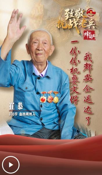 崔恭,100歲,1925年出生在山西平魯縣(今山西朔州市平魯區(qū))一個(gè)貧農(nóng)家庭。1942年參加八路軍,隸屬于晉綏分區(qū)新兵連,一個(gè)月后被選拔到雁北支隊(duì)通信排任通信員。1943年,雁北支隊(duì)撤銷后,歸屬晉綏軍區(qū)塞北軍分區(qū)警衛(wèi)連通信排,任機(jī)要通信員。1946年參加了解放朔縣城的戰(zhàn)斗。