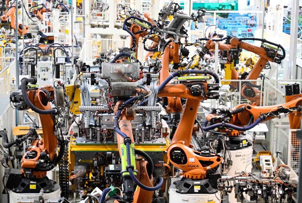 7月7日,機(jī)械臂等自動(dòng)化生產(chǎn)設(shè)備在天津經(jīng)濟(jì)技術(shù)開(kāi)發(fā)區(qū)一汽-大眾華北基地焊裝車(chē)間作業(yè)。新華社記者趙子碩 攝