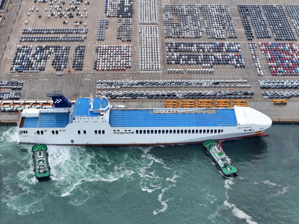6月29日,汽車運輸船??可綎|港口煙臺港,準備裝運出口汽車(無人機照片)。新華社發(fā)(唐克 攝)