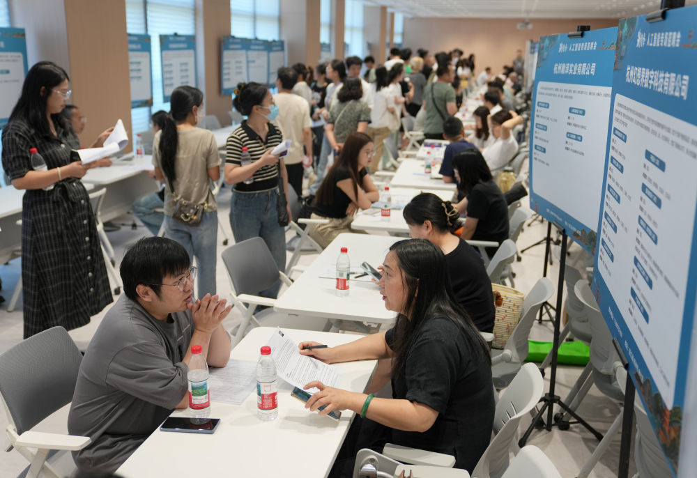 6月28日,求職者與招聘代表在2025年杭州市人工智能專場招聘會上洽談。新華社記者 韓傳號 攝