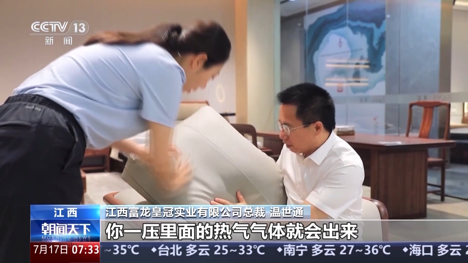 江西富龍皇冠實(shí)業(yè)有限公司總裁 溫世通:沙發(fā)靠墊后面我們?nèi)看蛄送笟饪?,一壓里面的熱氣氣體就會(huì)出來(lái),保證背部不會(huì)有很熱很燙的感覺(jué),在銷售方面保持增長(zhǎng)。
