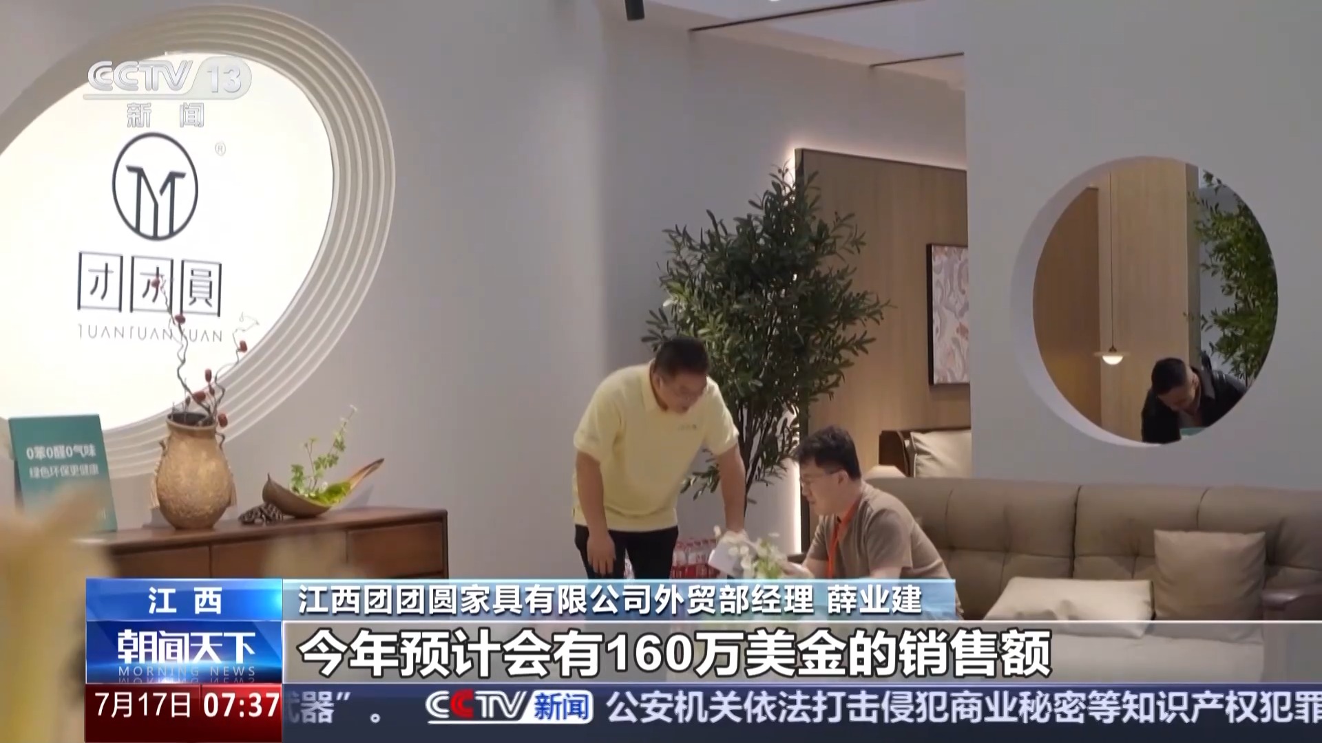 江西團(tuán)團(tuán)圓家具有限公司外貿(mào)部經(jīng)理 薛業(yè)建:家具在7月到11月是一個(gè)銷售旺季,今年預(yù)計(jì)會(huì)有160萬(wàn)美元的銷售額。