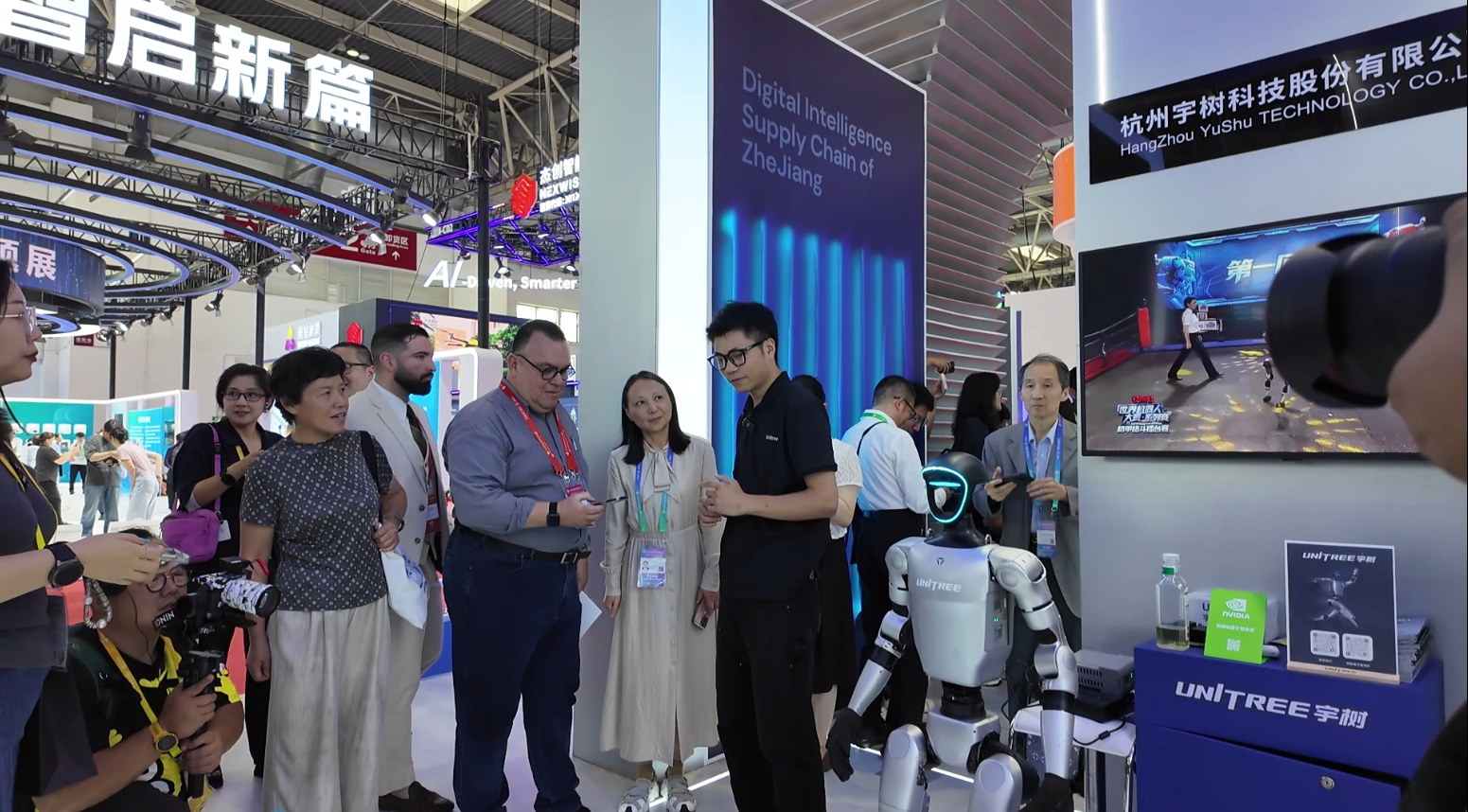 “創(chuàng)新味”還體現(xiàn)在機(jī)器人的身影多了。在英偉達(dá)展臺、湖北人形機(jī)器人展區(qū),以及參與浙江“數(shù)智潮涌 龍躍浙里”主題專區(qū)的宇樹科技和強(qiáng)腦科技展臺,靈巧手、機(jī)器狗、工業(yè)機(jī)器人、人形機(jī)器人等產(chǎn)品吸引著不少中外觀眾上前互動體驗。