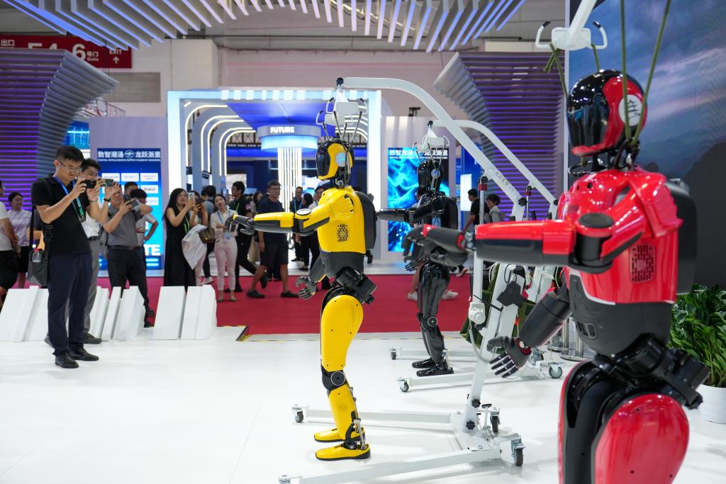 7月17日,在第三屆鏈博會數(shù)字科技鏈展區(qū),參觀者觀看人形機(jī)器人表演。新華社記者 鞠煥宗 攝