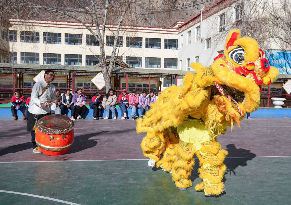 西藏昌都市洛隆縣,舞獅隊正在表演獅子舞。新華社記者 孫非 攝
