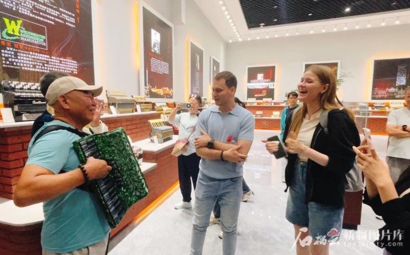 在塔城市民間手風琴藝人谷英福的伴奏下,留學生們聞聲起舞歡唱,《喀秋莎》《莫斯科郊外的晚上》《山楂樹》等一首首熟悉的旋律響起,前來參觀的游客們也加入了大合唱,熱鬧的氛圍瞬間拉滿?!斑@里多民族和睦相處,可以感受到音樂已成為大家交往交流交融的橋梁,呈現(xiàn)出了文化的豐富多樣性,這感覺很美妙?!眮碜远砹_斯的留學生妮拉有感而發(fā)。