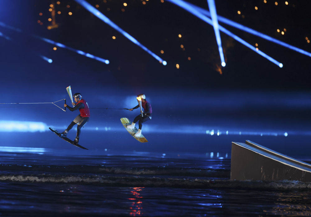 開幕式接近尾聲,中國(guó)滑水運(yùn)動(dòng)員以滑水的方式疾馳于湖上,共同點(diǎn)燃主火炬,水火交相輝映,現(xiàn)場(chǎng)再次沸騰。