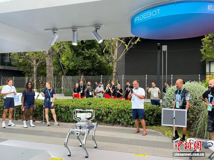 運(yùn)動員圍觀成都世運(yùn)村內(nèi)的機(jī)器狗。成都世運(yùn)會執(zhí)委會供圖