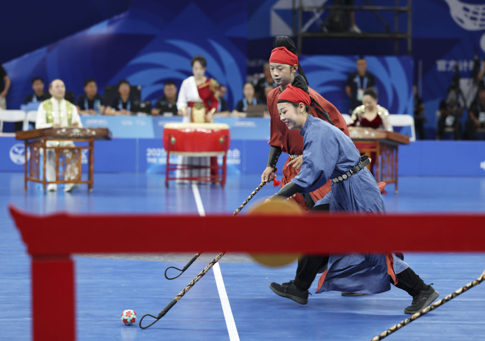 世運會不僅是競技的賽場,更是文明互鑒的窗口。8月6日,軟式曲棍球項目開賽。正式比賽之前,一場別開生面的“比賽”率先上演。循著鼓點、琴聲,演員們身著唐裝球衣競逐竹編彩球,一場金堂非遺步打球表演,將現場觀眾帶回到盛唐場景。