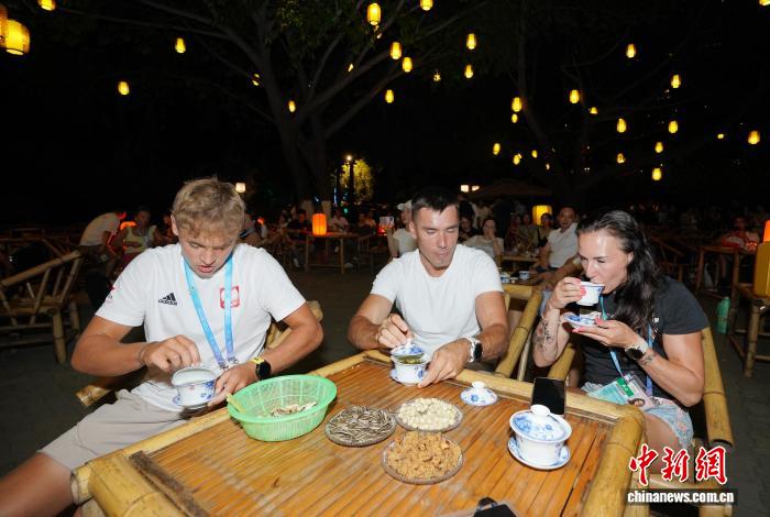 8月6日晚,成都世運(yùn)會外籍運(yùn)動員等在成都望江樓公園品成都蓋碗茶?!≈行律缬浾?安源 攝