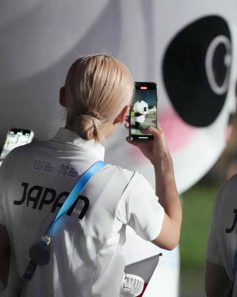 2025年8月7日,一名日本體育代表團(tuán)成員在開幕式上拍攝吉祥物“蜀寶”。當(dāng)日,第12屆世界運動會開幕式在成都舉行。新華社記者 胥冰潔 攝