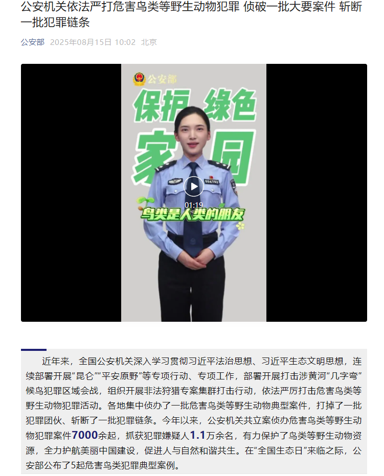近年來,全國公安機關深入學習貫徹習近平法治思想、習近平生態(tài)文明思想,連續(xù)部署開展“昆侖”“平安原野”等專項行動、專項工作,部署開展打擊涉黃河“幾字彎”候鳥犯罪區(qū)域會戰(zhàn),組織開展非法狩獵專案集群打擊行動,依法嚴厲打擊危害鳥類等野生動物犯罪活動。各地集中偵辦了一批危害鳥類等野生動物典型案件,打掉了一批犯罪團伙、斬斷了一批犯罪鏈條。今年以來,公安機關共立案偵辦危害鳥類等野生動物犯罪案件7000余起,抓獲犯罪嫌疑人1.1萬余名,有力保護了鳥類等野生動物資源,全力護航美麗中國建設,促進人與自然和諧共生。在“全國生態(tài)日”來臨之際,公安部公布了5起危害鳥類犯罪典型案例。