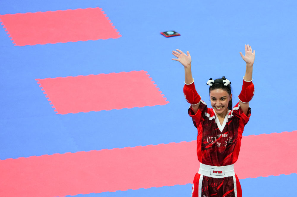 土耳其姑娘克倫奇是重度熊貓愛好者,贏下自由搏擊女子半接觸50公斤級(jí)半決賽后,她從容摘下護(hù)具,拿出一枚熊貓發(fā)卡戴在頭上。而她的背包里,足足塞了13個(gè)熊貓紀(jì)念品。