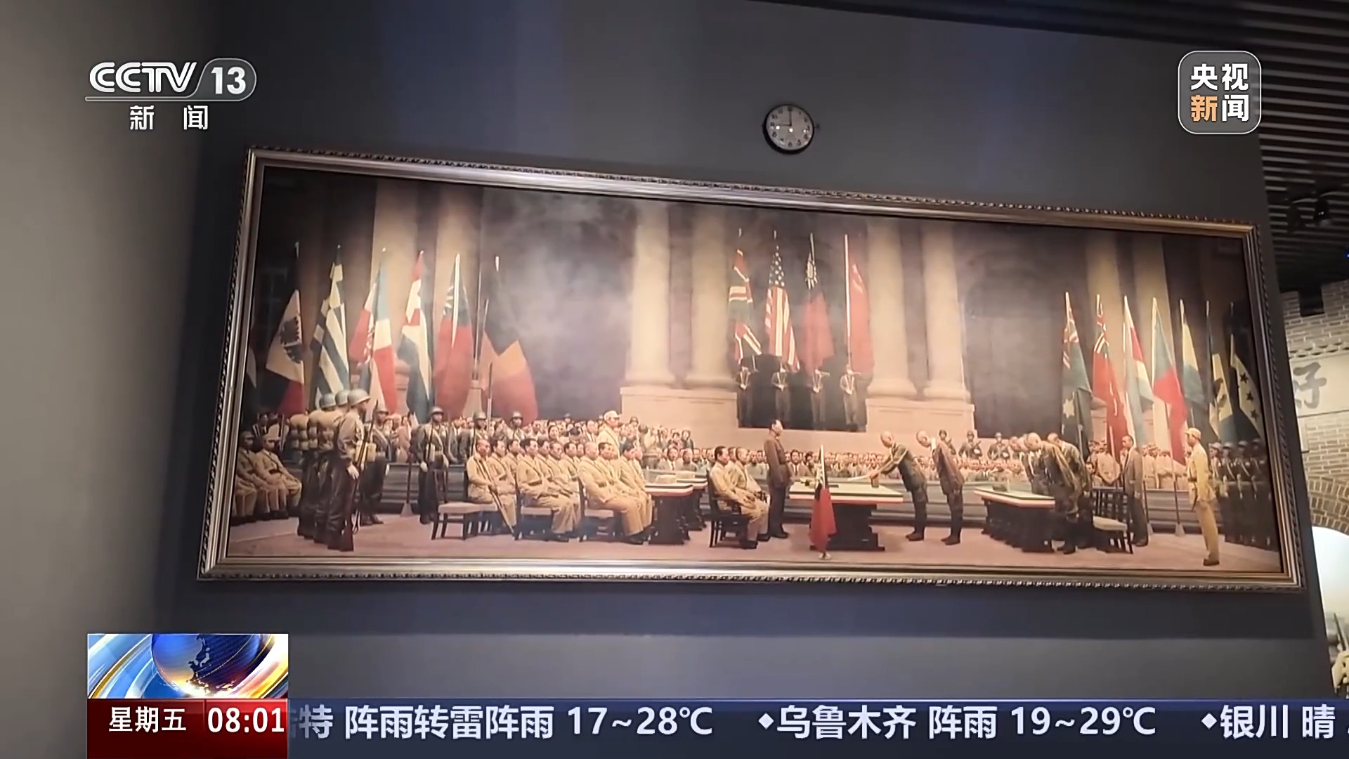 中國人民抗日戰(zhàn)爭紀念館展覽陳列部副主任 韓小昆:左側畫面有個角落,有一把空白的椅子是沒有畫人物的。整個作品形象里面有200多個人,但唯獨空了一把椅子。這是基于歷史進行的藝術創(chuàng)作,就是說,在戰(zhàn)爭中犧牲的英烈們也參加了這個受降儀式。