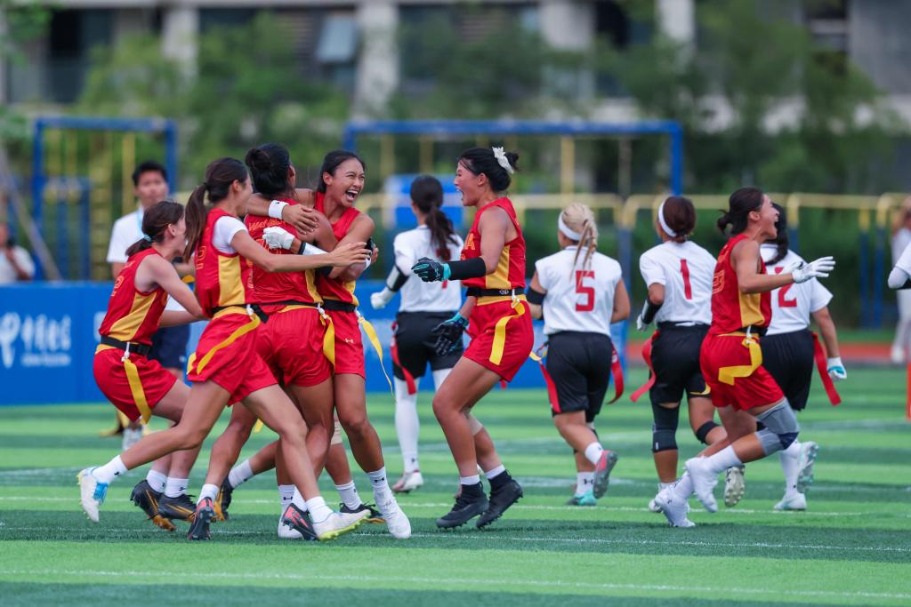 8月16日,中國隊球員在賽后慶祝勝利。當(dāng)日,在2025年成都世運會腰旗橄欖球女子5-8名安慰賽半決賽中,中國隊?wèi)?zhàn)勝日本隊。新華社記者 魏翔 攝