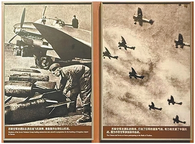 中國人民抗日戰(zhàn)爭紀念館中展示的蘇聯(lián)援華航空隊老照片。左側(cè)照片為蘇聯(lián)援華航空隊成員為飛機裝彈,準備轟炸被日軍占領(lǐng)的臺北松山機場。右側(cè)照片為1938年中蘇空軍參加徐州會戰(zhàn)。