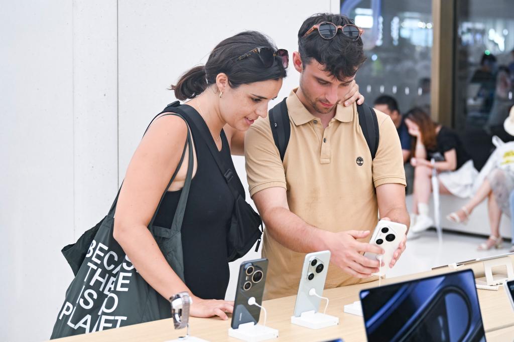 7月17日,兩名西班牙游客在位于上海市南京路步行街的華為商店里瀏覽手機(jī)產(chǎn)品。新華社記者 陳浩明 攝