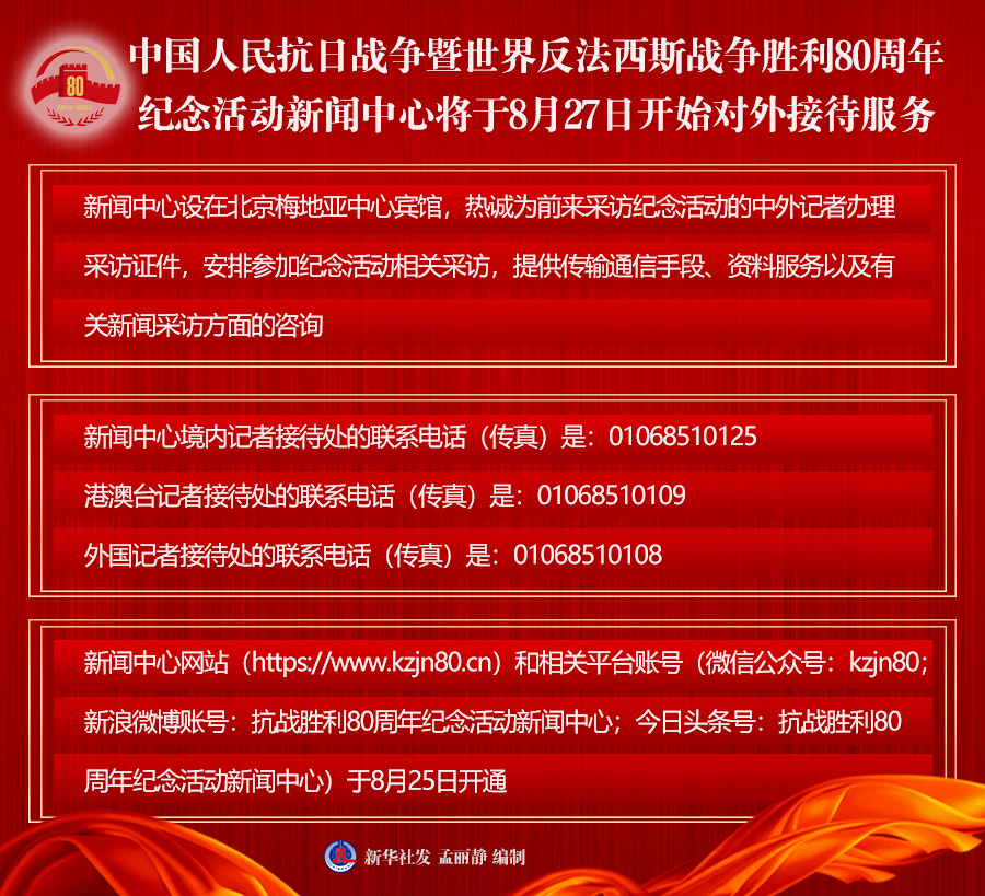 新聞中心網(wǎng)站(https://www.kzjn80.cn)和相關(guān)平臺賬號(微信公眾號:kzjn80;新浪微博賬號:抗戰(zhàn)勝利80周年紀(jì)念活動(dòng)新聞中心;今日頭條號:抗戰(zhàn)勝利80周年紀(jì)念活動(dòng)新聞中心)將于8月25日開通。