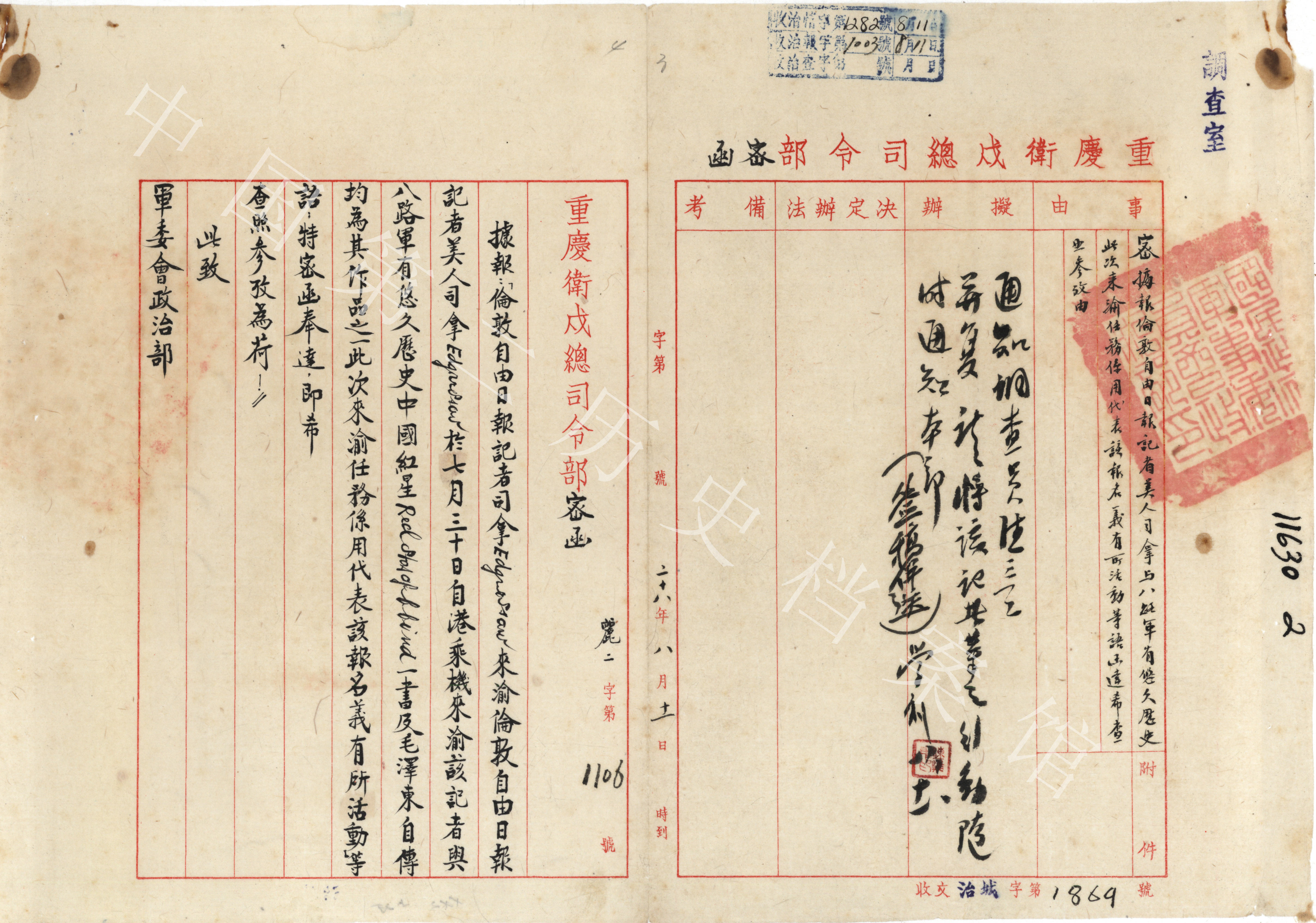 1939年8月重慶衛(wèi)戍總部向國民政府軍事委員會(huì)政治部報(bào)告斯諾在重慶活動(dòng)情形的密函(中國第二歷史檔案館藏)