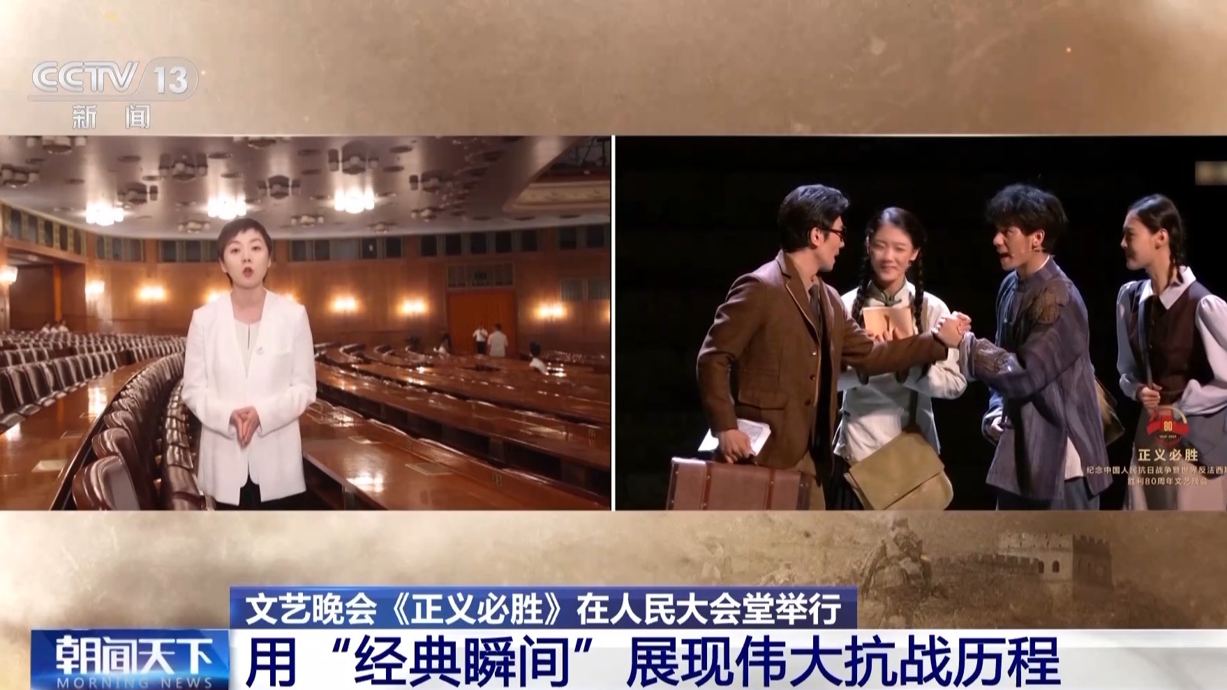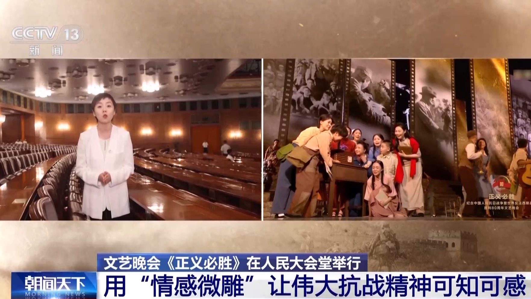 總臺(tái)央視記者 曹巖:從八月起我們一直在現(xiàn)場(chǎng)跟蹤記錄抗戰(zhàn)勝利80周年紀(jì)念晚會(huì)的排練,我個(gè)人覺(jué)得這場(chǎng)晚會(huì)最大的特征,就是在里面我們看到的不是一個(gè)又一個(gè)的獨(dú)立節(jié)目,而是一整部的情景史詩(shī)劇。