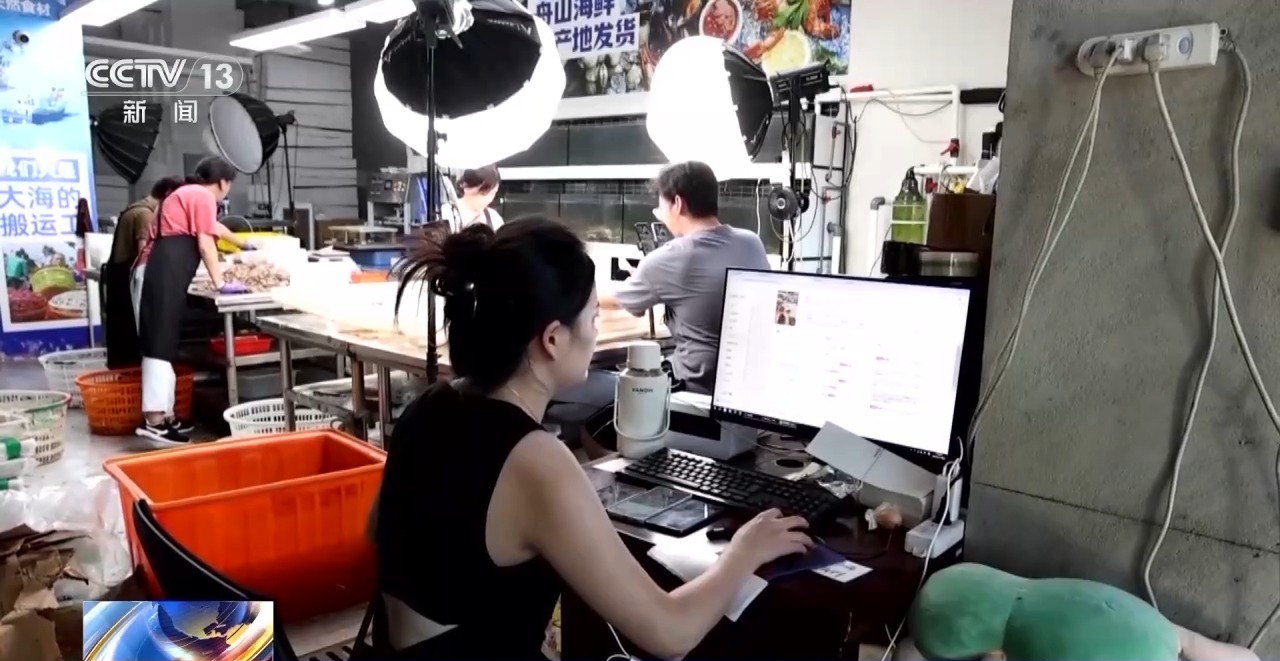 漁船忙著卸貨的同時,在距離碼頭不遠的電商產業(yè)園里,主播們正售賣新鮮上市的梭子蟹。為了縮短發(fā)貨時間,這家店鋪在直播的同時打包海鮮,即買即發(fā),每天可以發(fā)出六到七百個訂單。