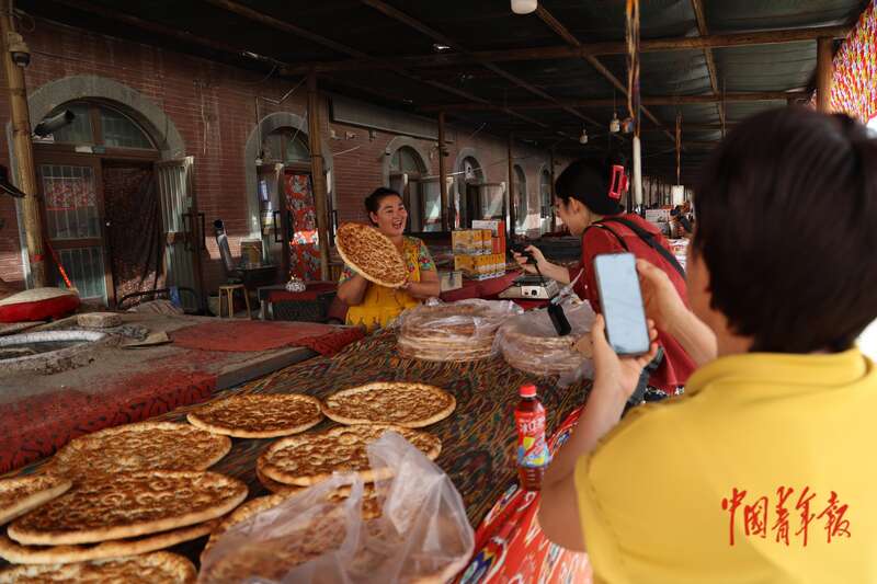9月9日,新疆巴州尉犁縣興平鎮(zhèn)達(dá)西村,店主向顧客展示新疆馕。毗鄰尉犁縣城的達(dá)西村打造了商業(yè)街、民宿風(fēng)情一條街,現(xiàn)有36家風(fēng)情園、9家民宿,旅游業(yè)成為當(dāng)?shù)卮迕裥碌脑鍪拯c(diǎn)。中青報(bào)·中青網(wǎng)記者 王鑫昕/攝