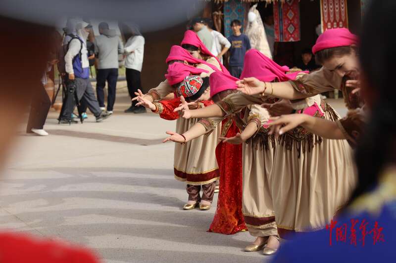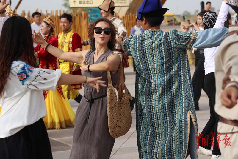9月9日,新疆巴州尉犁縣羅布人村寨景區(qū),游客和當(dāng)?shù)匮輪T一起跳舞。羅布人村寨集沙漠、河流、湖泊、森林、草原等自然景觀與獨(dú)特的羅布淖爾民俗文化景觀于一體,是外地游客體驗(yàn)新疆風(fēng)情的重要一站,深受人們喜愛。中青報(bào)·中青網(wǎng)記者 王鑫昕/攝