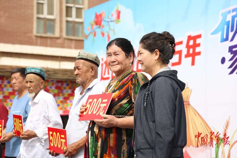 9月9日,新疆巴州尉犁縣興平鎮(zhèn)達(dá)西村,一場(chǎng)慶豐收活動(dòng)上,達(dá)西村黨委書記夏提古麗·熱合曼(右一)代表村集體向該村長(zhǎng)者發(fā)放慰問金。通過棉花種植、文化旅游等,2024年達(dá)西村集體收入達(dá)230.55萬(wàn)元。中青報(bào)·中青網(wǎng)記者 王鑫昕/攝
