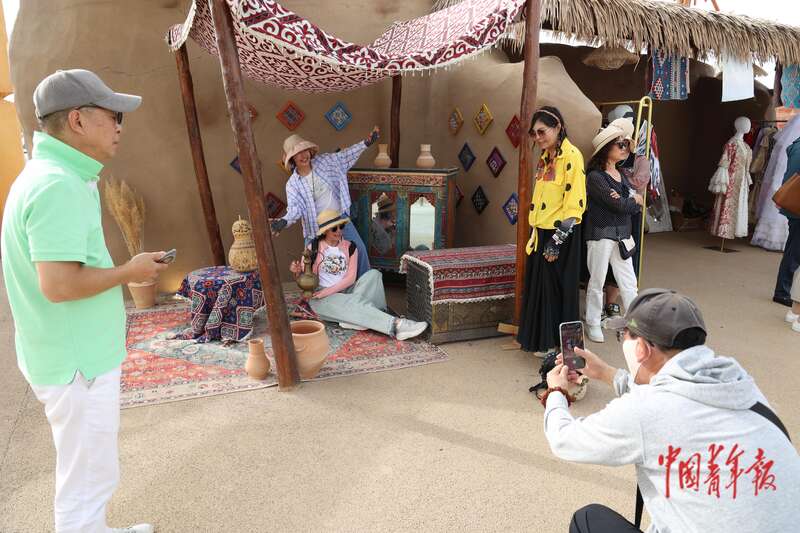 9月9日,新疆巴州尉犁縣羅布人村寨景區(qū),來自上海的游客在合影留念。2025年1月至8月,尉犁縣累計(jì)接待國(guó)內(nèi)游客313.6萬(wàn)人次,同比增長(zhǎng)23.55%,實(shí)現(xiàn)游客總花費(fèi)20.98億元,同比增長(zhǎng)27.38%。中青報(bào)·中青網(wǎng)記者 王鑫昕/攝