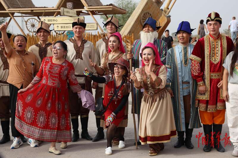9月9日,新疆巴州尉犁縣羅布人村寨景區(qū),一場(chǎng)演出結(jié)束后,游客和當(dāng)?shù)匮輪T合影留念。中青報(bào)·中青網(wǎng)記者 王鑫昕/攝