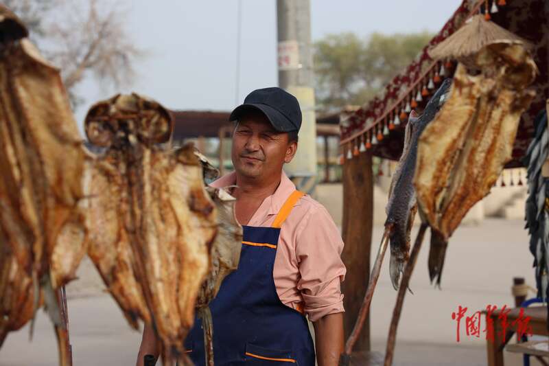 9月9日,新疆巴州尉犁縣羅布人村寨景區(qū),一位店主在現(xiàn)烤草魚。在尉犁縣,羅布人村寨在旅游扶貧、旅游惠民、旅游興縣等方面發(fā)揮著龍頭作用,景區(qū)從業(yè)人員80%以上是當(dāng)?shù)剞r(nóng)牧民。中青報(bào)·中青網(wǎng)記者 王鑫昕/攝