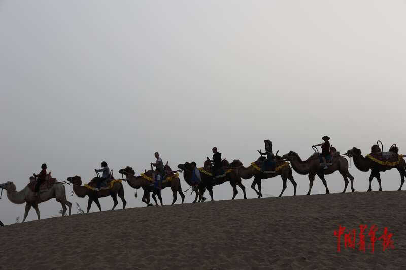 9月9日,新疆巴州尉犁縣羅布人村寨景區(qū),游客騎駱駝?dòng)^光。中青報(bào)·中青網(wǎng)記者 王鑫昕/攝