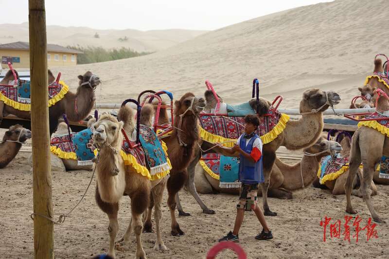 9月9日,新疆巴州尉犁縣羅布人村寨景區(qū),供游客乘騎的駱駝。中青報(bào)·中青網(wǎng)記者 王鑫昕/攝