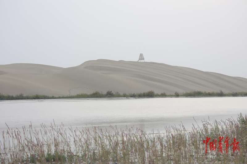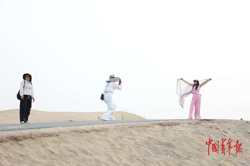 9月9日,新疆巴州尉犁縣羅布人村寨景區(qū),游客以廣袤的塔克拉瑪干沙漠為背景拍照留念。中青報(bào)·中青網(wǎng)記者 王鑫昕/攝