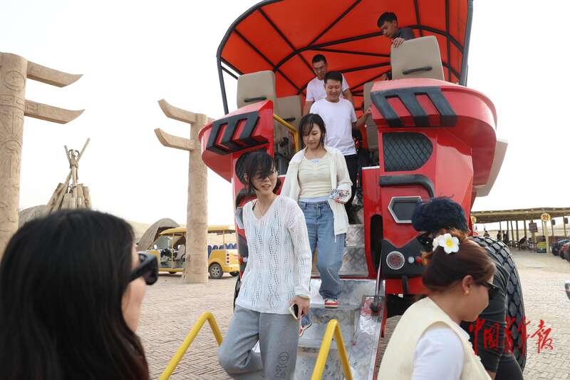 9月9日,新疆巴州尉犁縣羅布人村寨景區(qū),游客們走下被稱為“大腳怪”的沙漠觀光車。中青報(bào)·中青網(wǎng)記者 王鑫昕/攝