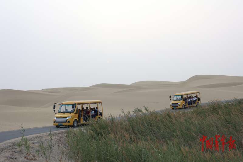 9月9日,新疆巴州尉犁縣羅布人村寨景區(qū),觀光車行進(jìn)在塔克拉瑪干沙漠中。中青報(bào)·中青網(wǎng)記者 王鑫昕/攝