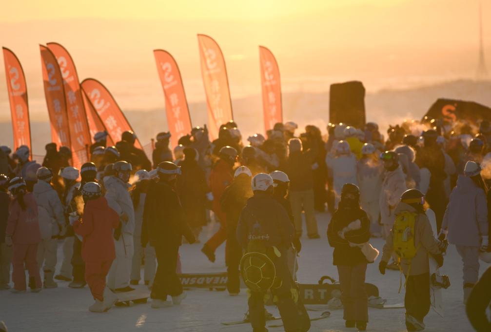 日落時(shí)分,阿勒泰市將軍山國(guó)際滑雪度假區(qū)的山頂區(qū)域人頭攢動(dòng)(2025年1月24日攝)。新華社記者 胡虎虎 攝