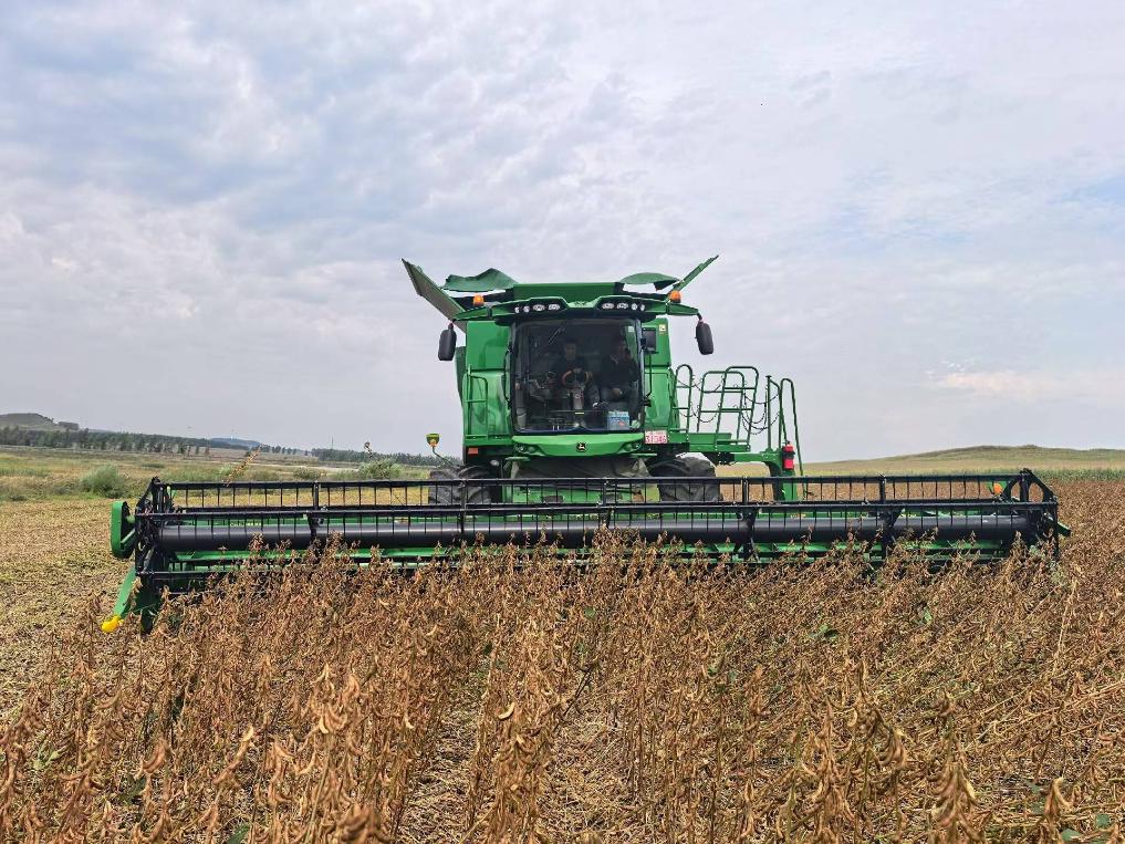 在黑龍江省七臺河市勃利縣恒山玉米專業(yè)合作社的一處地塊,一臺臺大型收割機往來穿梭,一排排飽滿的大豆植株被精準(zhǔn)卷入機身,金黃的豆粒隨即通過出糧口涌入運糧車。