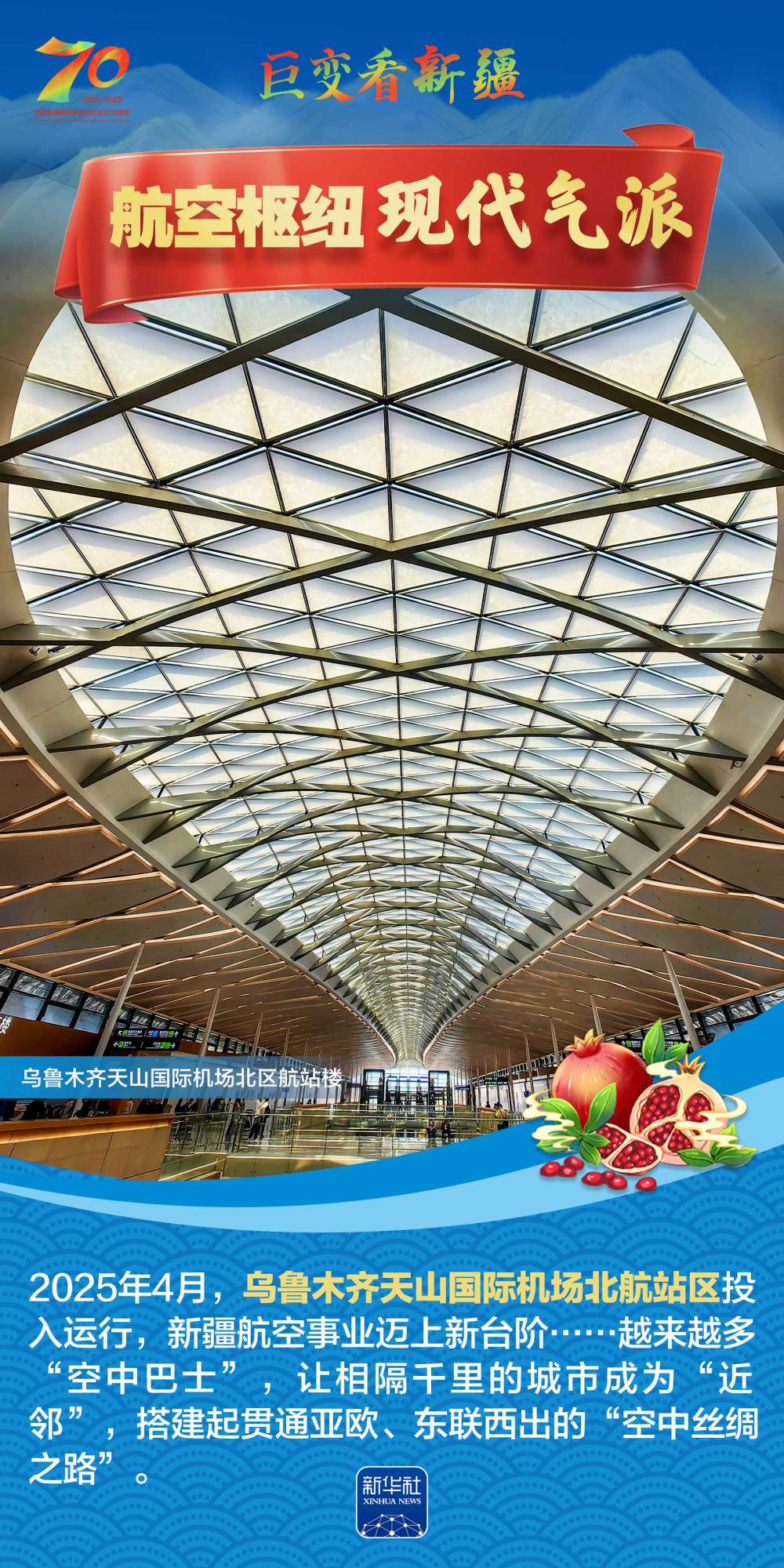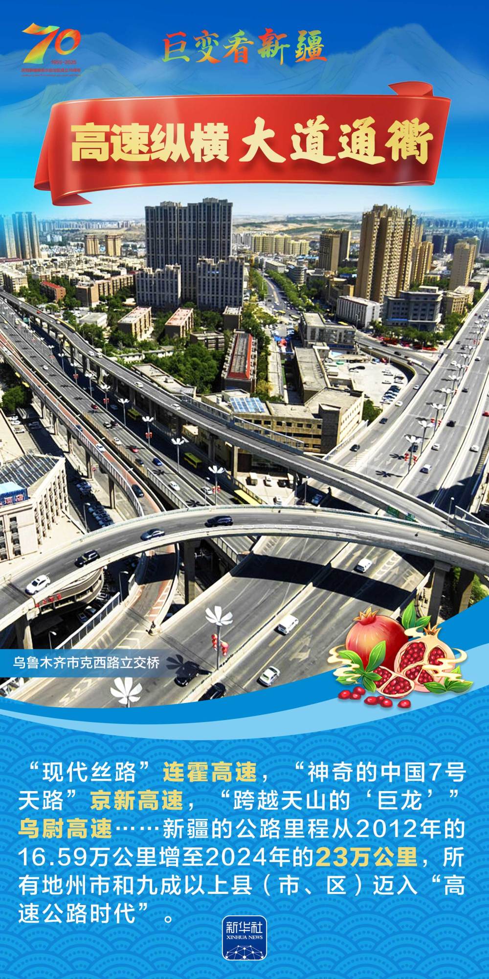 今年是新疆維吾爾自治區(qū)成立70周年。70年來(lái),新疆的交通建設(shè)日新月異。從駝鈴聲聲、馬蹄嘚嘚到鐵流縱橫、銀鷹高翔,一座座交通樞紐輻射四方,一條條“鋼鐵巨龍”蜿蜒逶迤,一個(gè)個(gè)支線機(jī)場(chǎng)星羅棋布,現(xiàn)代化的新疆立體交通網(wǎng)絡(luò)日益形成。讓我們跟隨這組海報(bào),一起見證穿越“三山兩盆”、貫通歐亞大陸的新時(shí)代新疆交通畫卷。