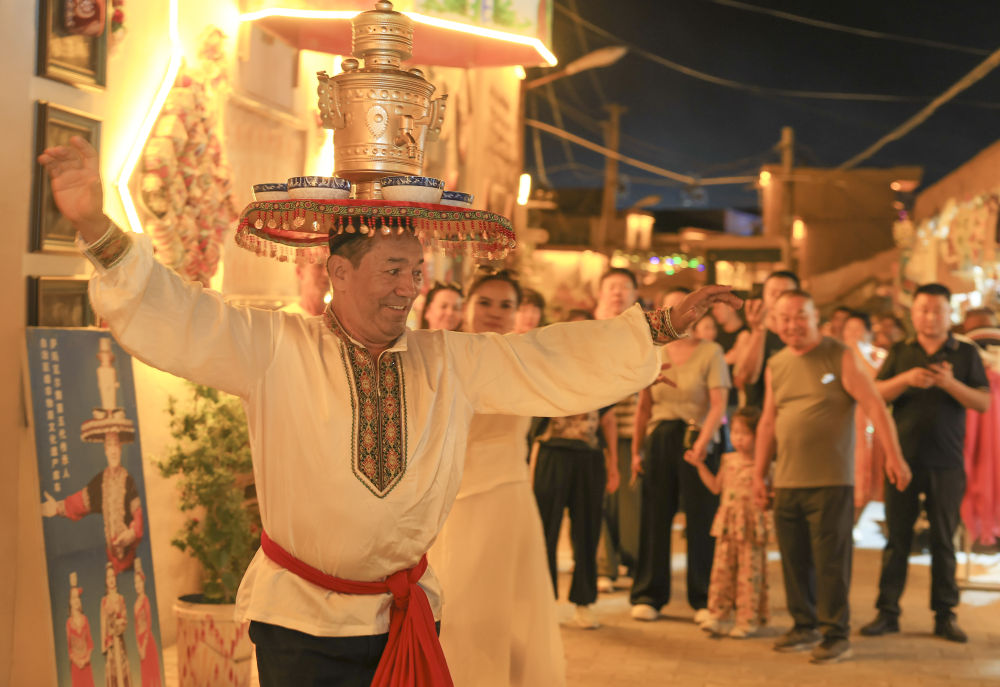夜幕降臨,煙火氣息在庫車?yán)铣菑浡?。廣場(chǎng)上傳來歡快的樂曲聲,舞者頭頂銅盤銅壺,腳步輕快,將迎賓之禮——薩瑪瓦爾舞展現(xiàn)在游客面前,掌聲與歡笑聲此起彼伏。
