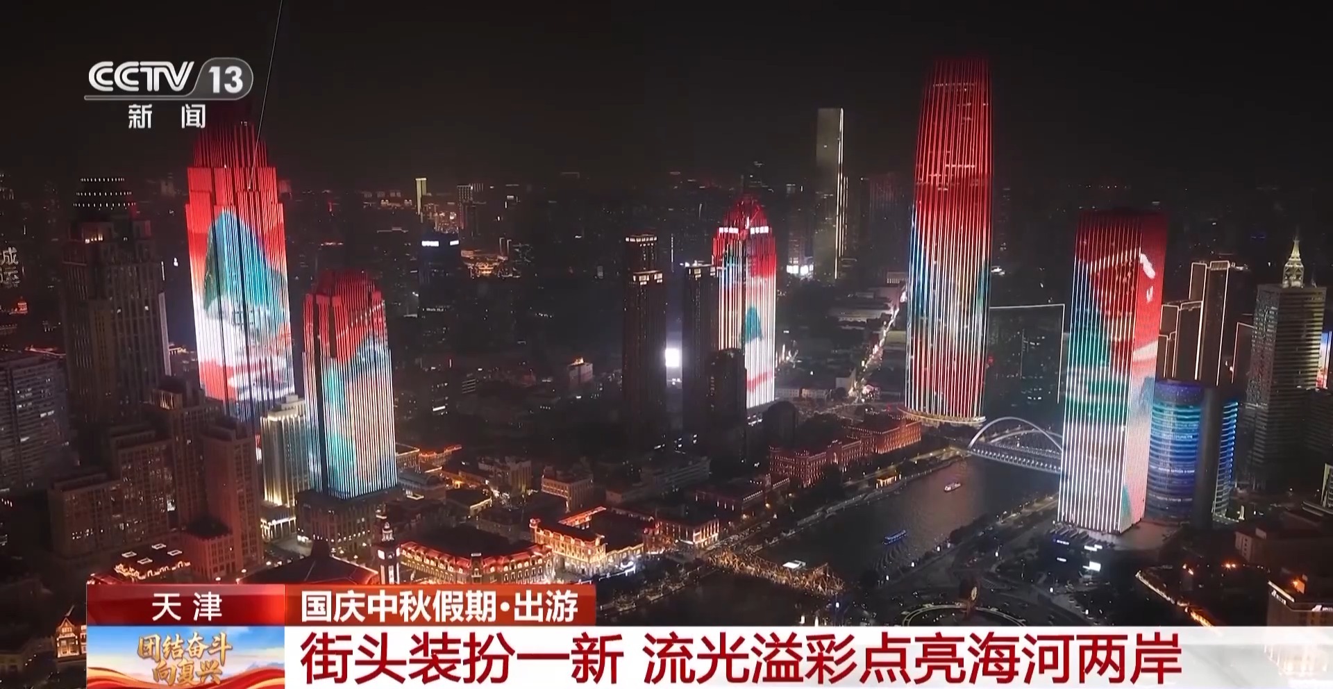 為慶祝國慶,天津街頭裝扮一新。1.8萬面國旗裝點城市街道,1.7萬多個花箱花籃鮮花盛開,80個新建提升的口袋公園全面開放,各個綠化節(jié)點、美麗街角裝扮一新,處處洋溢著喜慶祥和的節(jié)日氛圍。同時,天津還對海河夜景燈光秀進(jìn)行了升級,打造國慶主題創(chuàng)意燈光秀。燈光秀既展現(xiàn)了長城、黃河、長江等祖國壯麗風(fēng)光,也呈現(xiàn)了天津七里海濕地、盤山秋色等本地美景,一派喜氣祥和。