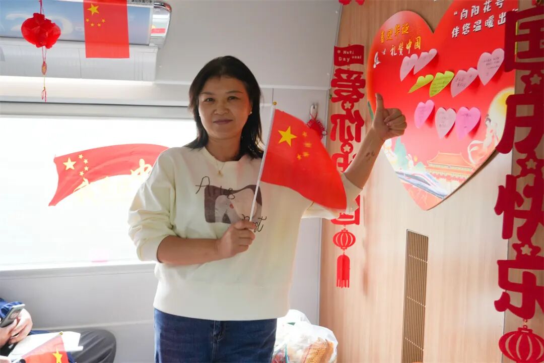 車廂內(nèi)掛滿條幅、彩帶和中國結(jié),洋溢著節(jié)日的喜慶氛圍。在舞蹈《親愛的你啊》的優(yōu)美旋律中,列車聯(lián)歡拉開序幕。