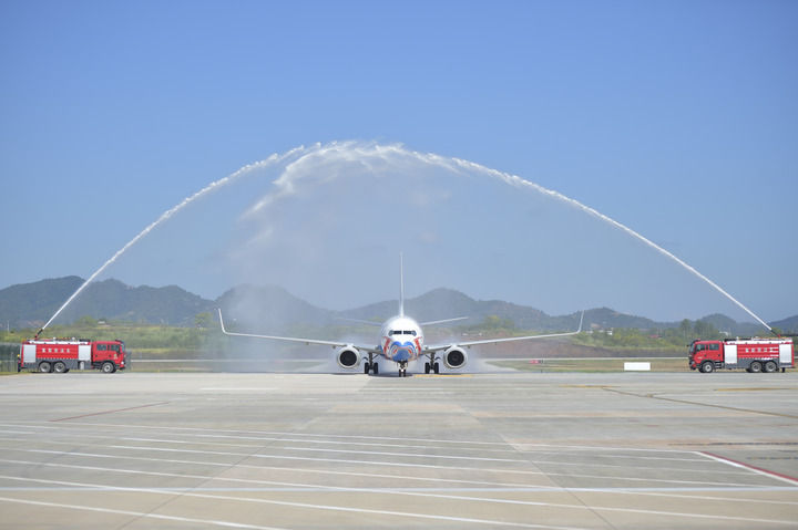 2025年9月28日,由中國國際航空執(zhí)飛的北京大興至瑞金航班飛抵瑞金機(jī)場后通過“水門”。新華社發(fā)(楊鑫 攝)