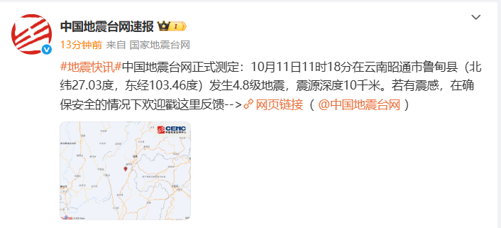 中國(guó)地震臺(tái)網(wǎng)正式測(cè)定:10月11日11時(shí)18分在云南昭通市魯?shù)榭h(北緯27.03度,東經(jīng)103.46度)發(fā)生4.8級(jí)地震,震源深度10千米。