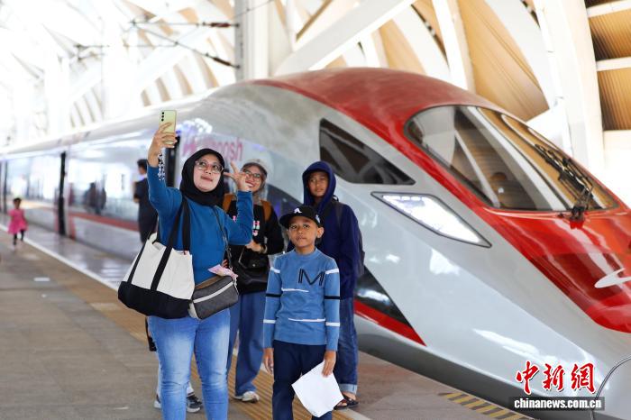 當(dāng)?shù)貢r(shí)間6月26日,旅客在印尼雅加達(dá)哈利姆高鐵站與列車合影。雅萬高鐵由中印尼兩國合作建設(shè),最高運(yùn)營時(shí)速350公里?!≈行律缬浾?李志全 攝
