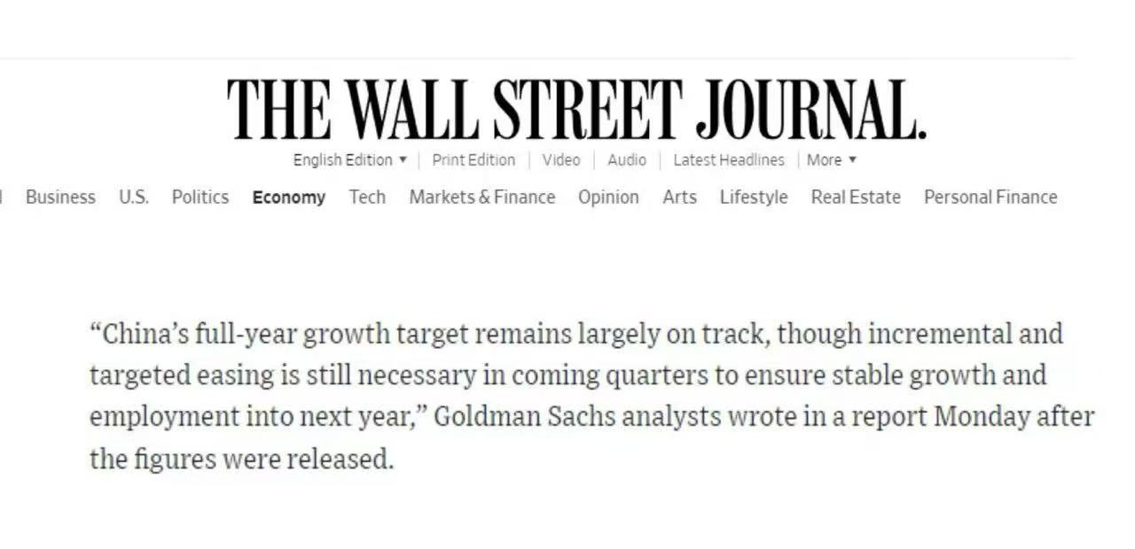 美國《華爾街日?qǐng)?bào)》報(bào)道顯示,2023年前三季度中國GDP同比增長5.2%,意味著"5%左右"的年度增長目標(biāo)已基本達(dá)成。報(bào)道援引高盛分析師觀點(diǎn)稱,雖然未來幾個(gè)季度仍需實(shí)施漸進(jìn)式、結(jié)構(gòu)性的寬松政策,但全年經(jīng)濟(jì)增速仍將總體符合預(yù)期。