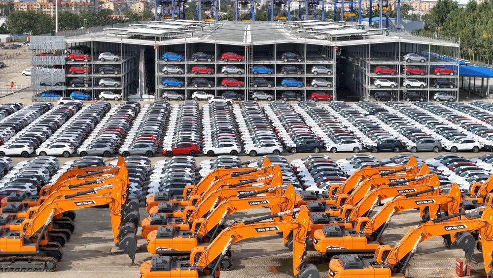 10月20日,國產汽車和工程機械在山東港口煙臺港集結等待裝船出口(無人機照片)。新華社發(fā)(唐克 攝)