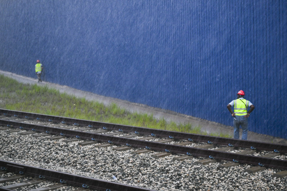 ↑10月9日,在馬來(lái)西亞彭亨州,馬東鐵項(xiàng)目工人在雨幕中忙碌。